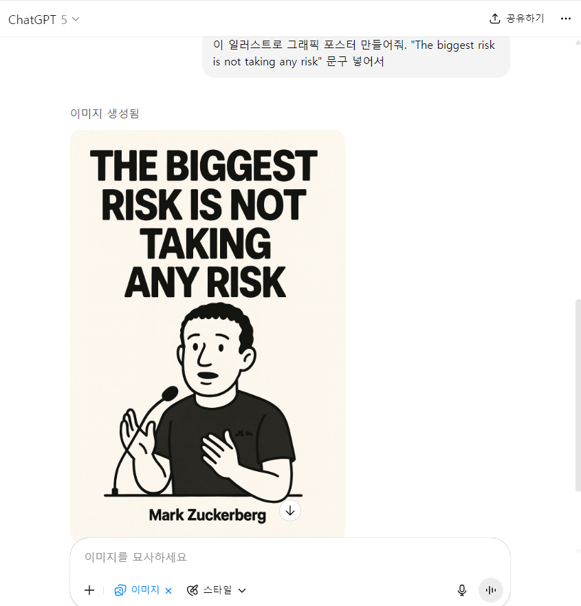 ํ๋กฌํํธ : ์ด ์ผ๋ฌ์คํธ๋ก ๊ทธ๋ํฝ ํฌ์คํฐ ๋ง๋ค์ด์ค. "The biggest risk is not taking any risk" ๋ฌธ๊ตฌ ๋ฃ์ด์